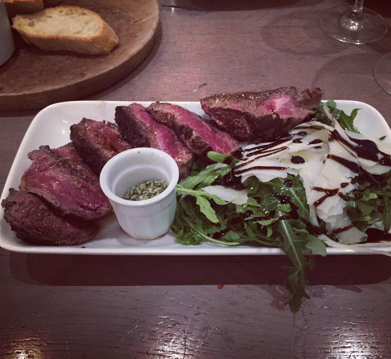 The wine menu had a nice variety of types and prices. My husband enjoyed £17.00 glasses of Brunello and I got very drunk on £7.oo dry whites. That sentence basically sums us right up. But, anyway, the food menu was a little confusing at first. We were not sure if everything was to be considered small, sharing plates, or if there were in fact proper entrees. We chose to go the starter and separate entrees route, which worked just fine, but you could definitely go either way. The gorgonzola bruschetta was absolutely delicious. Whipped into a mousse with truffles and then swirled onto fresh bread, the dish was divine. We were worried that we didn’t order enough food, but ended up not finishing our steak salad and pasta dish. Which was unfortunate because they were both really fresh with outstanding flavors.