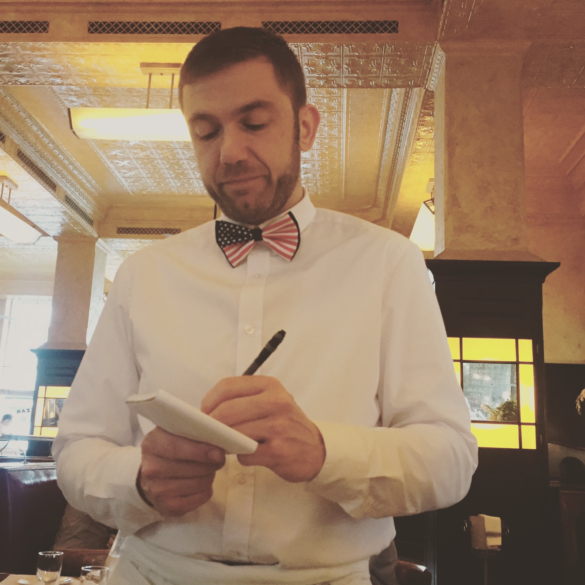 Balthazar is cool. It’s open and relaxed, elegant and classic. The perfect mix of a French bistro with a New York City vibe. It’s larger than most restaurants you’ll find in London–with high ceilings, oversized mirrors, and a grand staircase leading up to the ladies room where we took too many selfies of our Stars and Stripes ensembles. I was expecting to see a million Americans decked out for the occasion (and for the free meal) but it was kind of a letdown. I rose to the challenge, sporting an American Apparel flag tank and a striped skirt, but, aside from the waitstaff, there were only a few other red, white, and blue diners in the crowd. The staff was cute. They tried, with flag bow-ties and bandanas. It was a nice tribute coming from some heavy-accented Frenchmen.