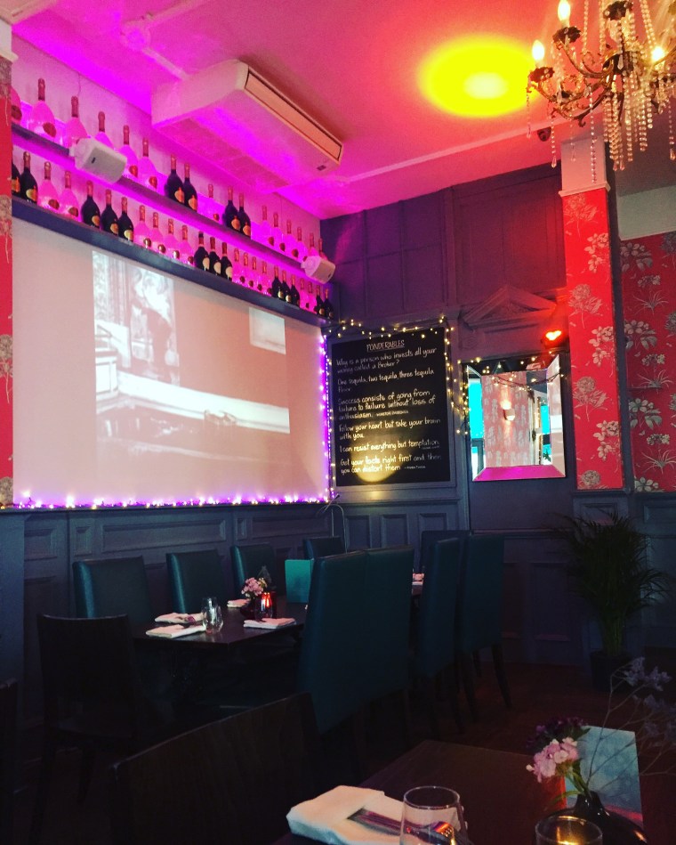 The establishment clearly enjoys the patrons it caters to, because they’re not doing themselves any favors. The place is decorated like the “boutique hotels” you would find up north, in a place like Derby, not in Notting Hill. There are neon lights, champagne bottles on display, and ornate chandeliers. Someone thought those things made a statement when put together, and then decided to take it all even further with menu chalkboards, black and white movies playing from a projector, and shabby chic wallpaper. It is design overload, meant to wow the uncultured guest where a multitude of trends must equal good taste.