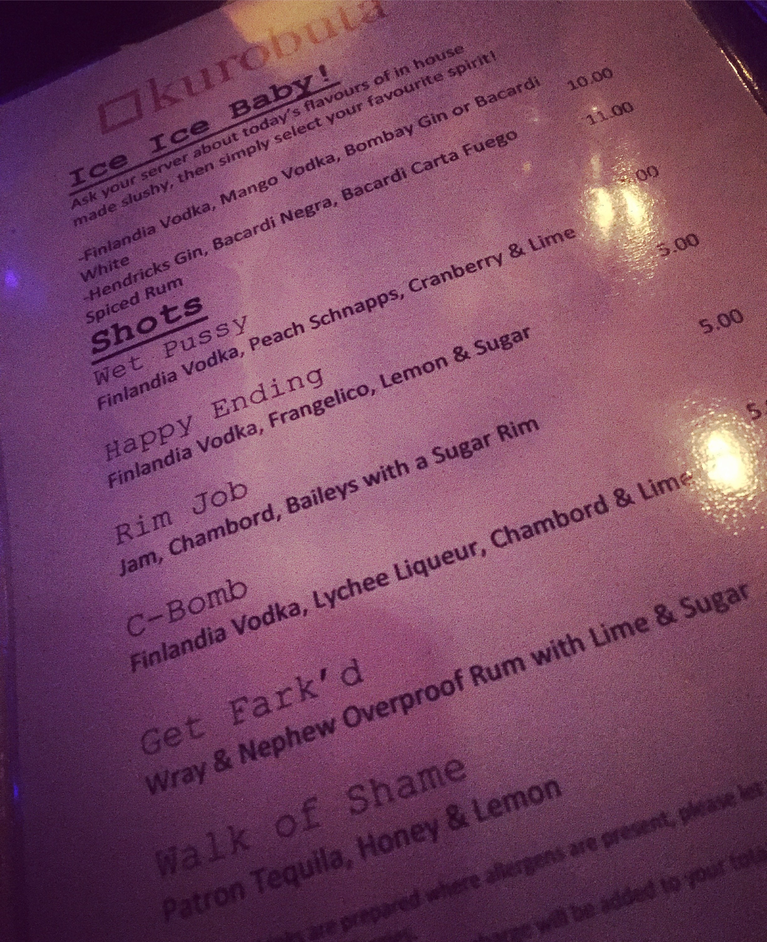 This was my first visit to the King’s Road Kurobuta. From the outside, it looks like a low-key casual bar/restaurant. Inside, it was more lively than I expected, with excited patrons enjoying sake bombs, which kept inadvertently waking up the dining crowd. The servers were cool and upbeat, keeping with the great energy. The menu was sassy and fun. There was nothing dull about Kurobuta, which made it the perfect venue for our girls night out.