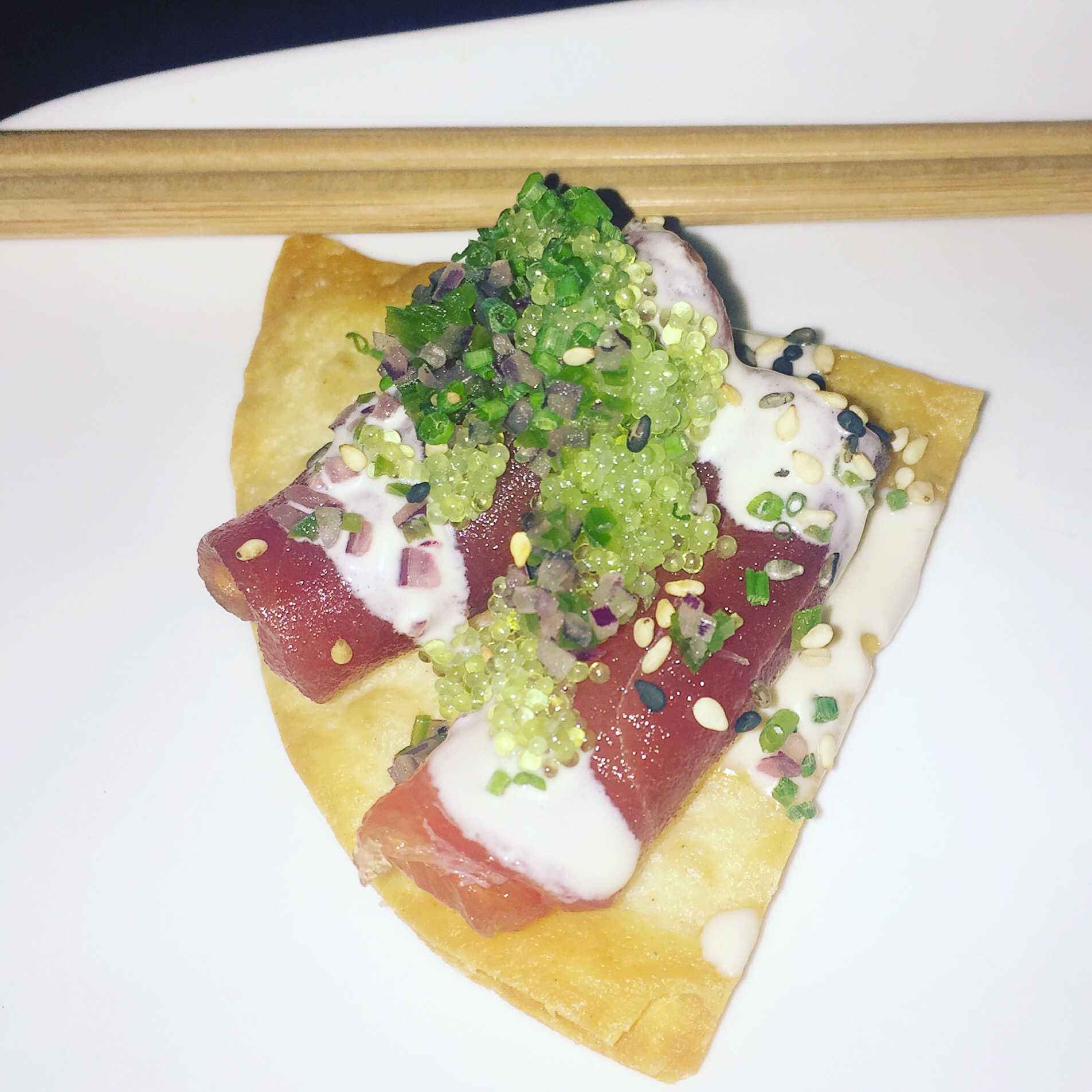 Onto the food. Everything we had was fabulous. We were unsure of the Kurobuta portion sizes (or our appetites after pre-gaming with a giant cheese plate and prosecco at the house) so we started with just a few things to share. The grilled aubergine, shrimp tempura maki, and tuna sashimi pizza. They were all delicious. The tuna pizza was much smaller than expected, and so tasty, that I would recommend for any small party sharing to order two right off the bat. We were still hungry with those small teasers, so we threw in two more items which came out surprisingly fast. The spicy tuna maki and the pumpkin tempura. Both, again, amazing. The girls agreed on the pumpkin for their favorite dish, for me, it was the eggplant (aubergine). Really, though, it doesn’t appear that you could go wrong with any dish at Kurobuta. Tuna sashimi pizza at Kurobuta, London