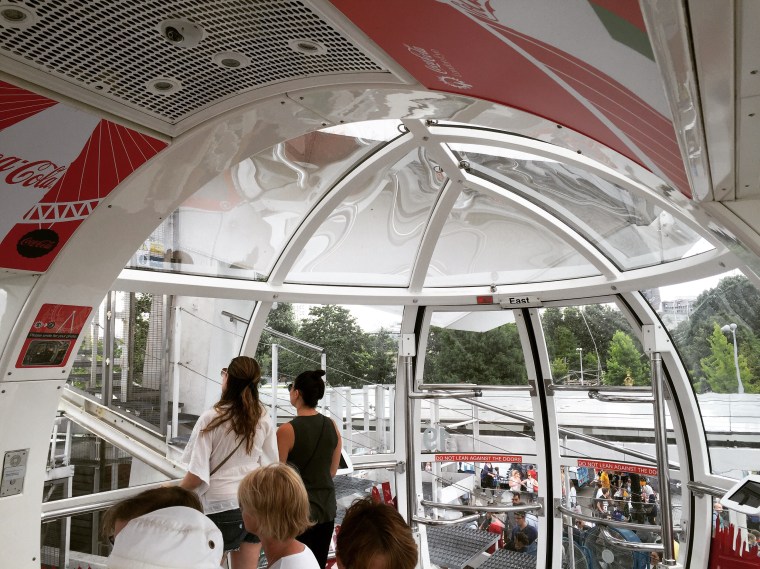 Once we navigated through the switchback line and the rude employees, we were finally ready, after about an hour, to hop on board the egg. I say hop because you literally have to run and jump onto the Eye. It doesn’t stop for you. I could never imagine anything like that being in line with the U.S safety standards. But, anyway, you jump onto this egg-shaped capsule that moves at a snail’s pace to show you every angle of the city.