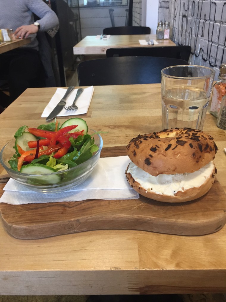 Despite the deliciousness available at B Bagel Bakery Bar, I thought their table service was a little strange. A bagel is the type of thing you want to order up front, seeing the choices you’re faced with, pay, and then sit with your food once it has been handed to you. At B Bagel, if you want to sit, you have to participate in a full table service song and dance. Very annoying for a bill that ends up less than £4.oo. You don’t get to look at your options, you have to interact with more people than you may care to, and if you want to eat just half your bagel and wrap it back up in the nice stiff parchment paper you would expect to see, well you just can’t. Their bagels come exposed on a platter, and, for the weirdest part, WITH A STRANGE LITTLE SALAD. I do not understand it. That salad does not match a bagel, nor does it make my bagel look any more appetizing. It actually detracts from what is going on. It had strange dressed red peppers on top and made me channel Dorothy. I wasn’t in America anymore.