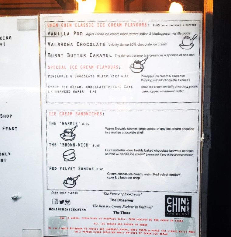 You’ll find Chin Chin Labs right in the heart of the Camden Market. Not my favorite location to have to brave on a busy, crowded Saturday, but well worth it, trust me. The line for Chin Chin moves pretty quickly. Once you’re towards the front, you get to peek at the menu and decide on your order. You may go back and forth a few times as everything sounds so delicious.